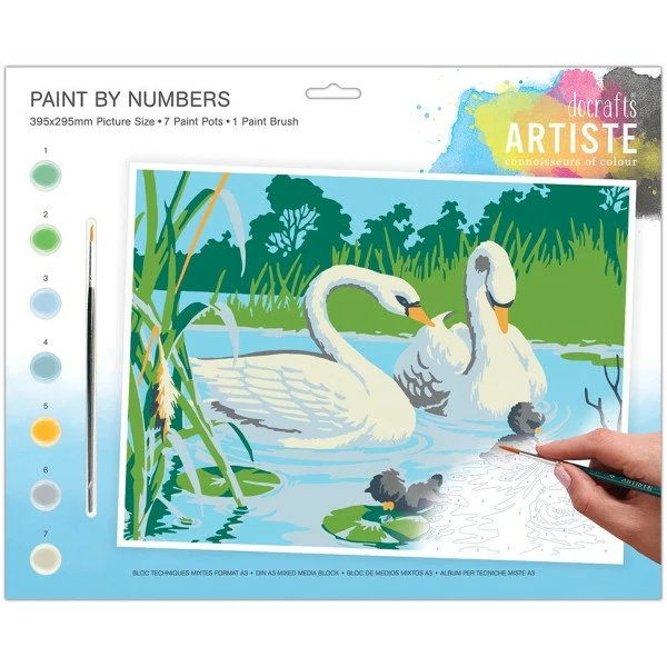 Ce Kit peinture numéro Cygnes vous permettra de devenir un véritable petit artiste peintre ! Vous découvrirez à travers ce kit créatif la peinture au numéro qui offre une méthode d’initiation à la peinture idéale pour les débutants.Vous pourrez réaliser un beau tableau de 39,5 x 29,5 cm sur le thème « Cygnes »