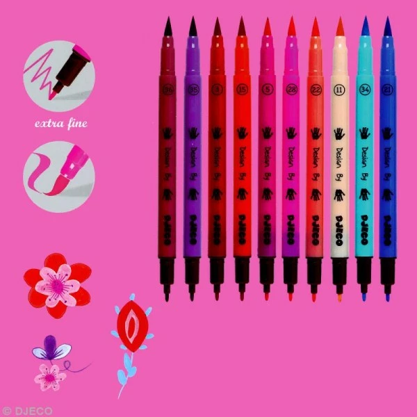 Assortiment de 10 feutres pinceaux Djeco, thème Fille, pour coloriage et dessin. Ces jolis feutres possèdent une double pointeune pointe fine pour la précision et une pointe souple pinceau pour les aplats.